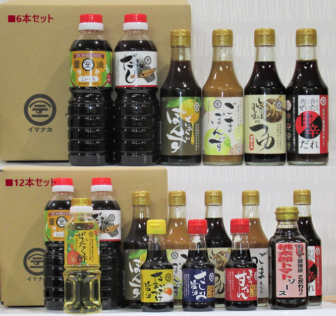 【内容】濃口醤油・和風だし・肉のぜいたく甘辛だれ・ぜいたくぽんず・ごまぽんず・しいたけ風味のつゆ ■ぜいたく12本セット(写真:下)原材料をぜいたくに使用した今中醤油の味を深く知ってもらえるセットです。